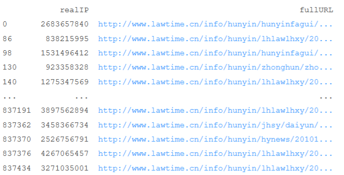# 筛选满足一定浏览次数的IP IP_count = info3['realIP'].value_counts() # 找出IP集合 IP = list(IP_count.index) count = list(IP_count.values) # 统计每个IP的浏览次数,并存放进IP_count数据框中,第一列为IP,第二列为浏览次数 IP_count = pd.DataFrame({'IP':IP,'count':count}) print(IP_count) # 筛选出浏览网址在n次以上的IP集合 n = 2 index = IP_count.loc[:,'count']>n IP_index = IP_count.loc[index,'IP'] print(IP_index)
