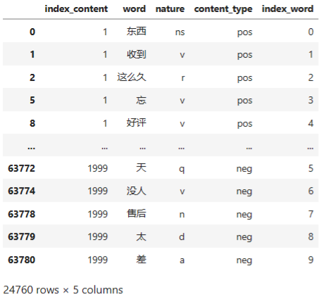 worker = lambda s: [(x.word, x.flag) for x in psg.cut(s)] # 自定义简单分词函数 seg_word = content.apply(worker) # 将词语转为数据框形式,一列是词,一列是词语所在的句子ID,最后一列是词语在该句子的位置 n_word = seg_word.apply(lambda x: len(x)) # 每一评论中词的个数 n_content = [[x+1]*y for x,y in zip(list(seg_word.index), list(n_word))] index_content = sum(n_content, []) # 将嵌套的列表展开,作为词所在评论的id seg_word = sum(seg_word, []) word = [x[0] for x in seg_word] # 词 nature = [x[1] for x in seg_word] # 词性 content_type = [[x]*y for x,y in zip(list(reviews['content_type']), list(n_word))] content_type = sum(content_type, []) # 评论类型 result = pd.DataFrame({"index_content":index_content, "word":word, "nature":nature, "content_type":content_type}) # 删除标点符号 result = result[result['nature'] != 'x'] # x表示标点符号 # 删除停用词 stop_path = open("./stoplist.txt", 'r',encoding='UTF-8') stop = stop_path.readlines() stop = [x.replace('\n', '') for x in stop] word = list(set(word) - set(stop)) result = result[result['word'].isin(word)] # 构造各词在对应评论的位置列 n_word = list(result.groupby(by = ['index_content'])['index_content'].count()) index_word = [list(np.arange(0, y)) for y in n_word] index_word = sum(index_word, []) # 表示词语在改评论的位置 # 合并评论id,评论中词的id,词,词性,评论类型 result['index_word'] = index_word