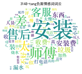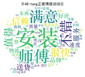 # 给情感值大于0的赋予评论类型(content_type)为pos,小于0的为neg emotional_value['a_type'] = '' emotional_value['a_type'][emotional_value['amend_weight'] > 0] = 'pos' emotional_value['a_type'][emotional_value['amend_weight'] < 0] = 'neg' # 查看情感分析结果 result = emotional_value.merge(word, left_on = 'index_content', right_on = 'index_content', how = 'left') result = result[['index_content','content_type', 'a_type']].drop_duplicates() confusion_matrix = pd.crosstab(result['content_type'], result['a_type'], margins=True) # 制作交叉表 (confusion_matrix.iat[0,0] + confusion_matrix.iat[1,1])/confusion_matrix.iat[2,2] # 提取正负面评论信息 ind_pos = list(emotional_value[emotional_value['a_type'] == 'pos']['index_content']) ind_neg = list(emotional_value[emotional_value['a_type'] == 'neg']['index_content']) posdata = word[[i in ind_pos for i in word['index_content']]] negdata = word[[i in ind_neg for i in word['index_content']]] # 绘制词云 import matplotlib.pyplot as plt from wordcloud import WordCloud # 正面情感词词云 freq_pos = posdata.groupby(by = ['word'])['word'].count() freq_pos = freq_pos.sort_values(ascending = False) backgroud_Image=plt.imread('./pl.jpg') wordcloud = WordCloud(font_path="C:\Windows\Fonts\STZHONGS.ttf", max_words=100, background_color='white', mask=backgroud_Image) pos_wordcloud = wordcloud.fit_words(freq_pos) plt.imshow(pos_wordcloud) plt.title("3148-tang正面情感词词云") plt.rcParams['font.sans-serif'] = 'SimHei' # 设置中文显示 plt.axis('off') plt.show() # 负面情感词词云 freq_neg = negdata.groupby(by = ['word'])['word'].count() freq_neg = freq_neg.sort_values(ascending = False) neg_wordcloud = wordcloud.fit_words(freq_neg) plt.imshow(neg_wordcloud) plt.title("3148-tang负面情感词词云") plt.rcParams['font.sans-serif'] = 'SimHei' # 设置中文显示 plt.axis('off') plt.show() # 将结果写出,每条评论作为一行 posdata.to_csv("./posdata.csv", index = False, encoding = 'utf-8') negdata.to_csv("./negdata.csv", index = False, encoding = 'utf-8')