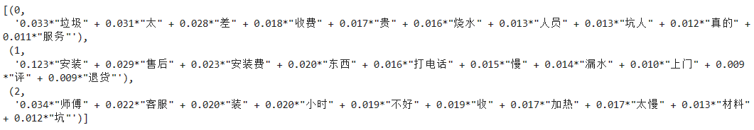 # LDA主题分析 pos_lda = models.LdaModel(pos_corpus, num_topics = 3, id2word = pos_dict) neg_lda = models.LdaModel(neg_corpus, num_topics = 3, id2word = neg_dict) pos_lda.print_topics(num_words = 10) neg_lda.print_topics(num_words = 10)