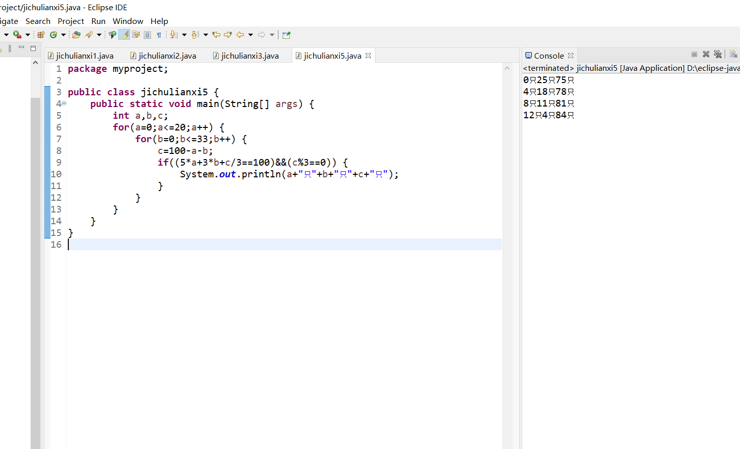 满足a+b+c=100; 5*a+3*b+c/3=100条件可得。