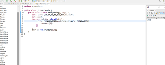 定义一个数组,静态初始化,从数组第一项判断置否符合条件,符合做累加操作。