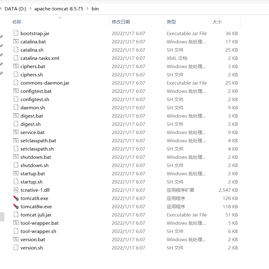其中startup.bat用于启动服务器,shutdown.bat用于关闭服务器。两个常用的可执行程序。