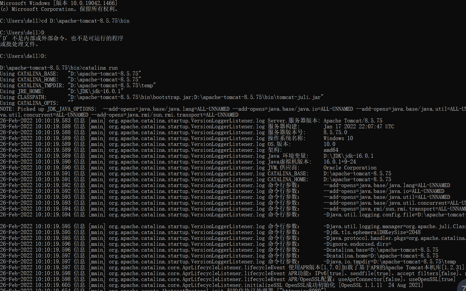 输入命令启动,首先进入tomcat的bin目录下,在这里我转换到了D盘,然后输入命令catalina run即可,此种方式再启动失败的情况下会给你显示启动失败的原因,推荐第一次安装时以这种方式启动。