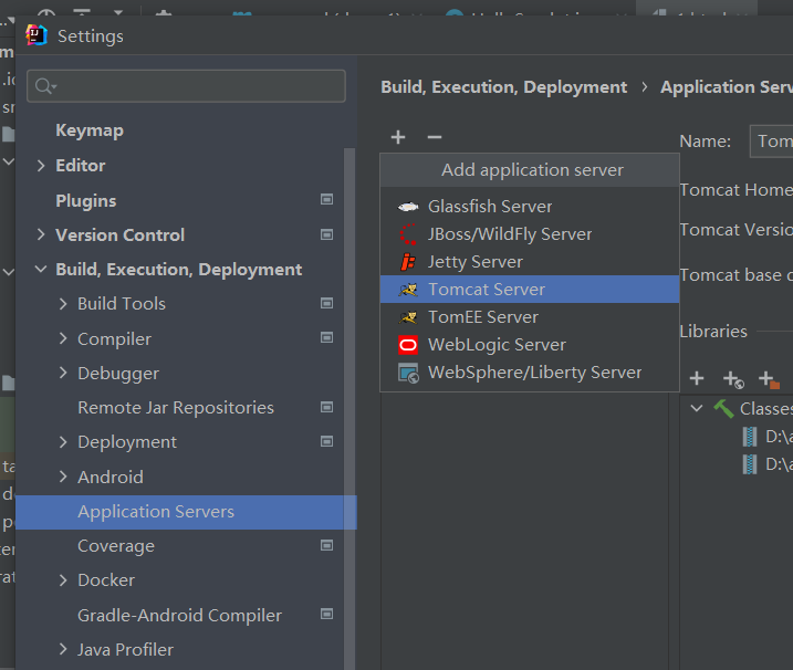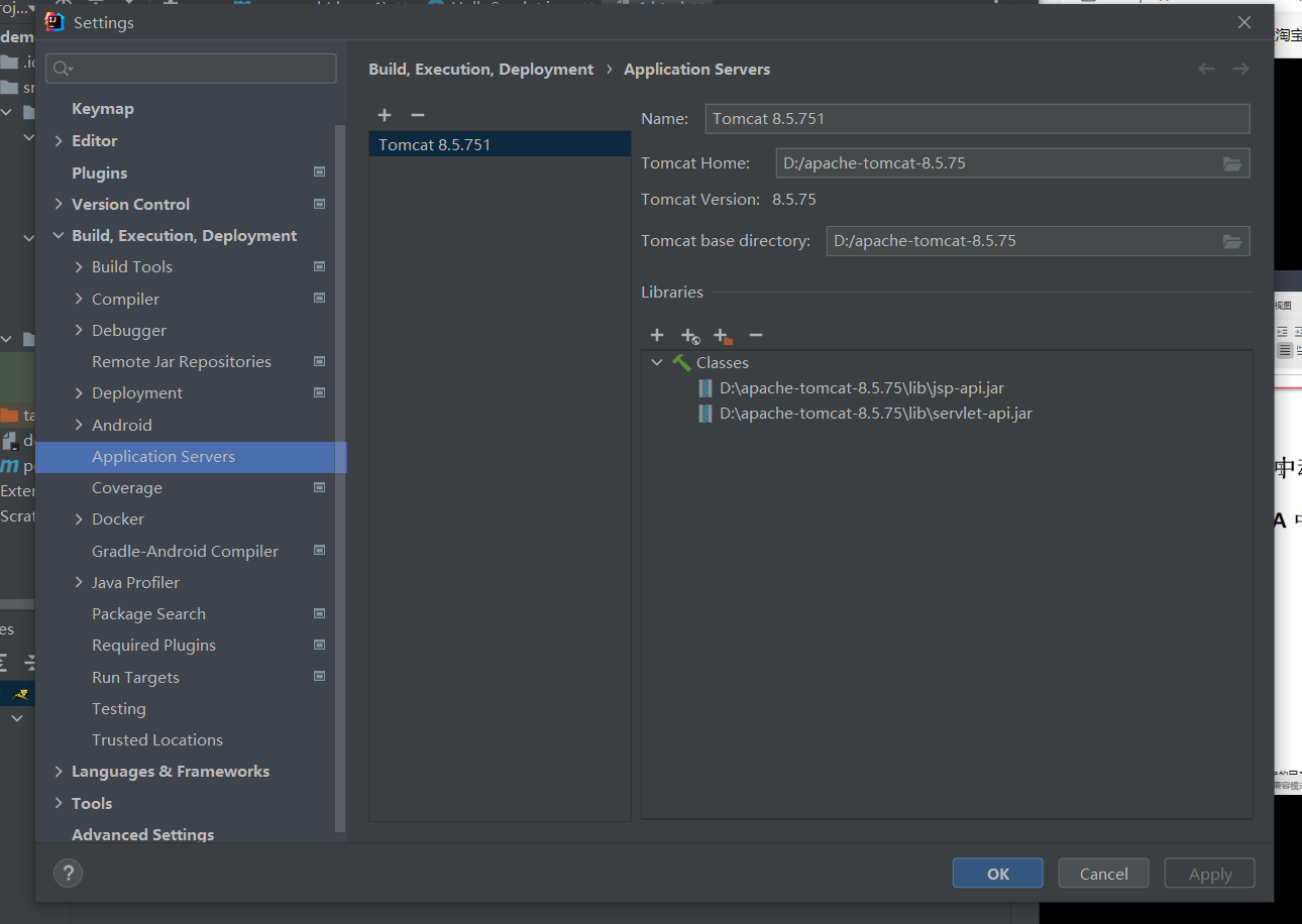 1.2 在Build,Execution,Deployment下找到Application Servers选项,在右侧栏点击“+”,添加Tomcat服务器,然后在最右侧栏里填写Tomcat的地址,即可。完成页面如下: