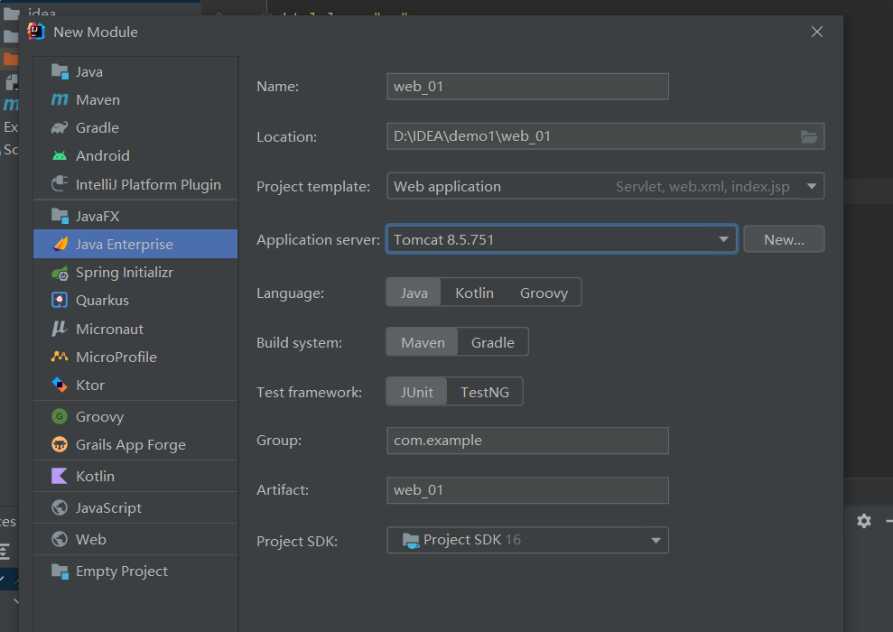 创建Java Enterprise,修改Name,更改模块模板为Web application,添加Application server(刚刚配置好的Tomcat)然后next即可,创建成功如下图: