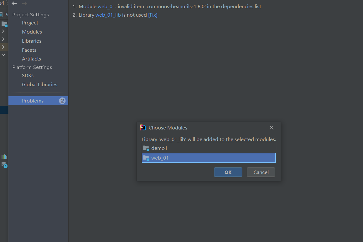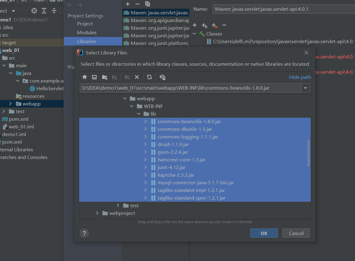 方法一:将要添加的jar包导入lib目录中,在lib目录下选中这些jar包添加到类库中,结果如图: