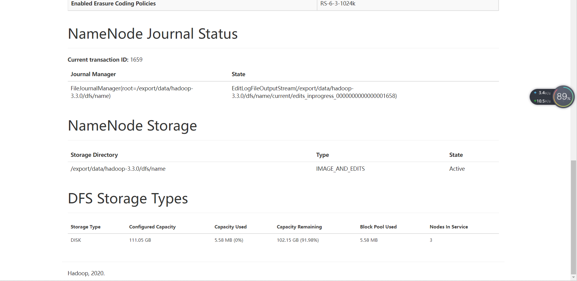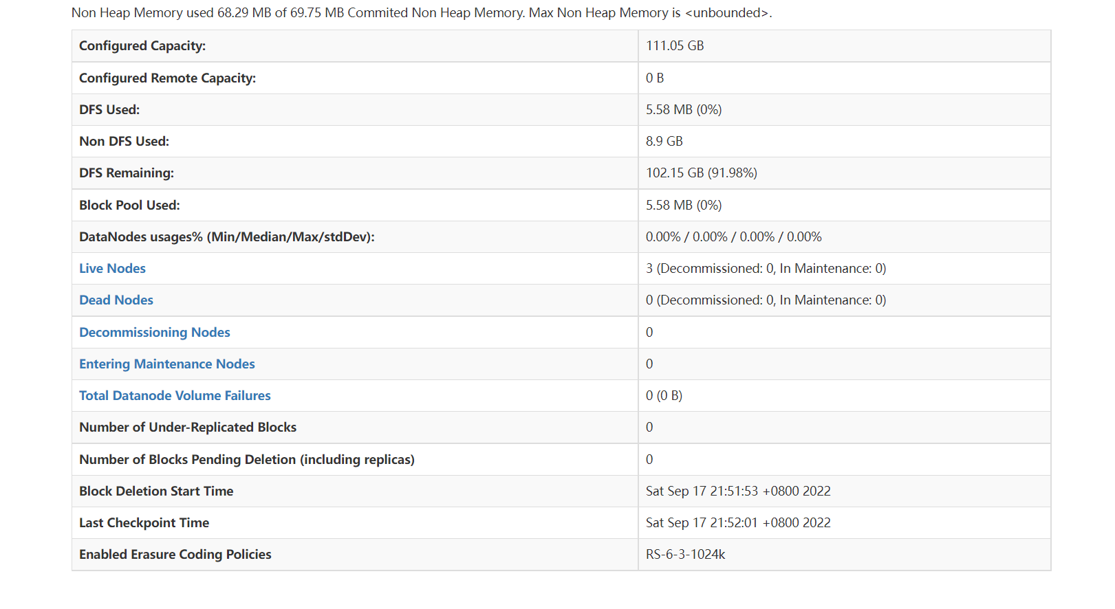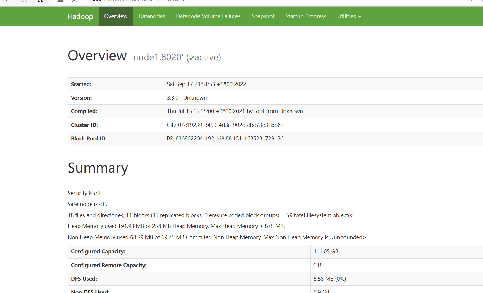可以打开域名:9870进入到WebUI界面,查看集群状态