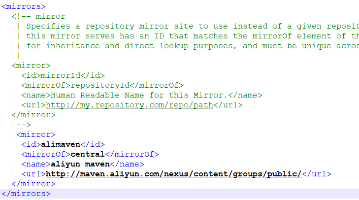 <mirror> <id>alimaven</id> <mirrorOf>central</mirrorOf> <name>aliyun maven</name> <url>http://maven.aliyun.com/nexus/content/groups/public/</url> </mirror>