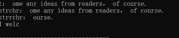 1 #include <stdio.h> 2 #include <string.h> 3 #include <stdlib.h> 4 int main(void) 5 { 6 char str[] = "I welcome any ideas from readers, of course."; 7 char *lc = strchr(str, 'o'); 8 char *t = (char*) malloc (strlen(lc)+1); 9 strcpy (t,lc); 10 printf("t: %s\n", lc); 11 printf("strchr: %s\n", lc); 12 char *rc = strrchr(str, 'o'); 13 printf("strrchr: %s\n", rc); 14 char c=*lc; 15 *lc = 0; 16 printf("%s\n", str); 17 18 return 0; 19 }