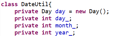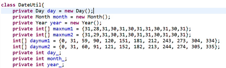2.定义类DateUtil、Day、Month、Year,在类在DateUtil中创建类Day的对象,在类Month中创建类Year的对象;