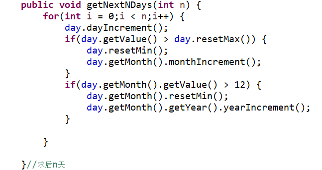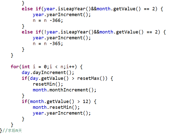2.与题目集四7-2不同的地方还有就是将求下n天以及求前n天的方法进行改进,在题目集四7-2中是一天一天的推算,而这题中是先一年一年的算,当n小于366时再一天一天的推算。这样修改的好处是当n特别大时,代码的运行更快。