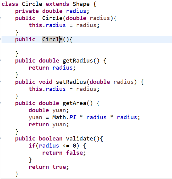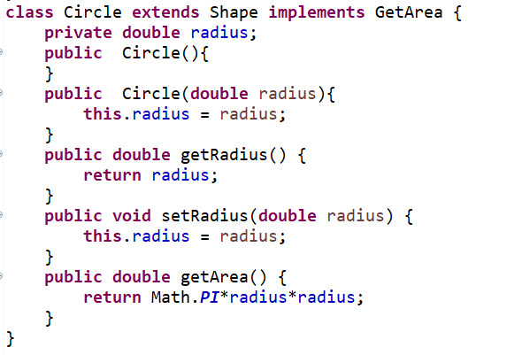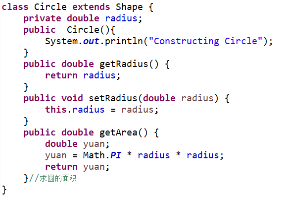 3.类Circle,继承自Shape,有一个私有实型的属性radius(半径),重写父类继承来的求面积方法,求圆的面积;