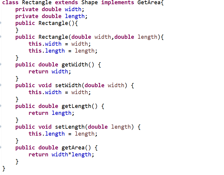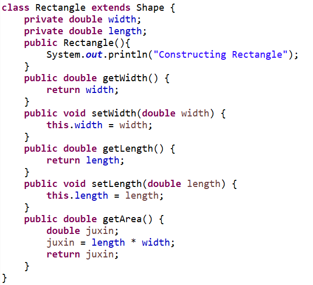 3.类Rectangle,继承于类Shape,私有属性有width和length,表示矩形的长和宽,重写父类的方法getArea() ,求矩形的面积;