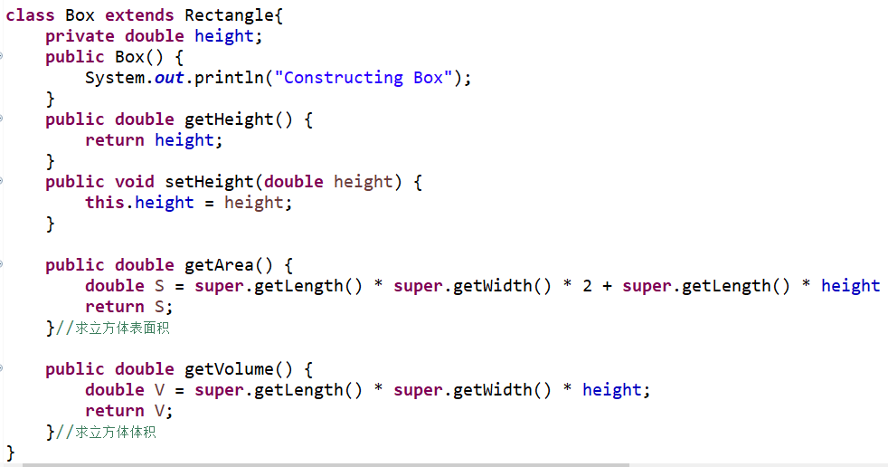 重写父类继承来的求面积方法,求立方体表面积,此外,定义一求立方体体积的方