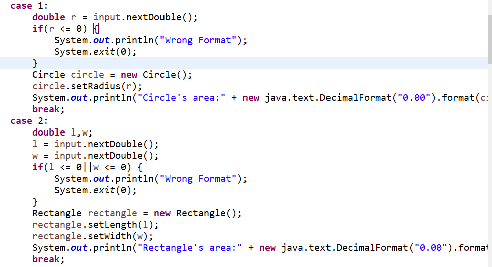 假如数据输入非法(包括圆、矩形、球及立方体对象的属性不大于0和输入选择值非1-4),系统输出Wrong Format