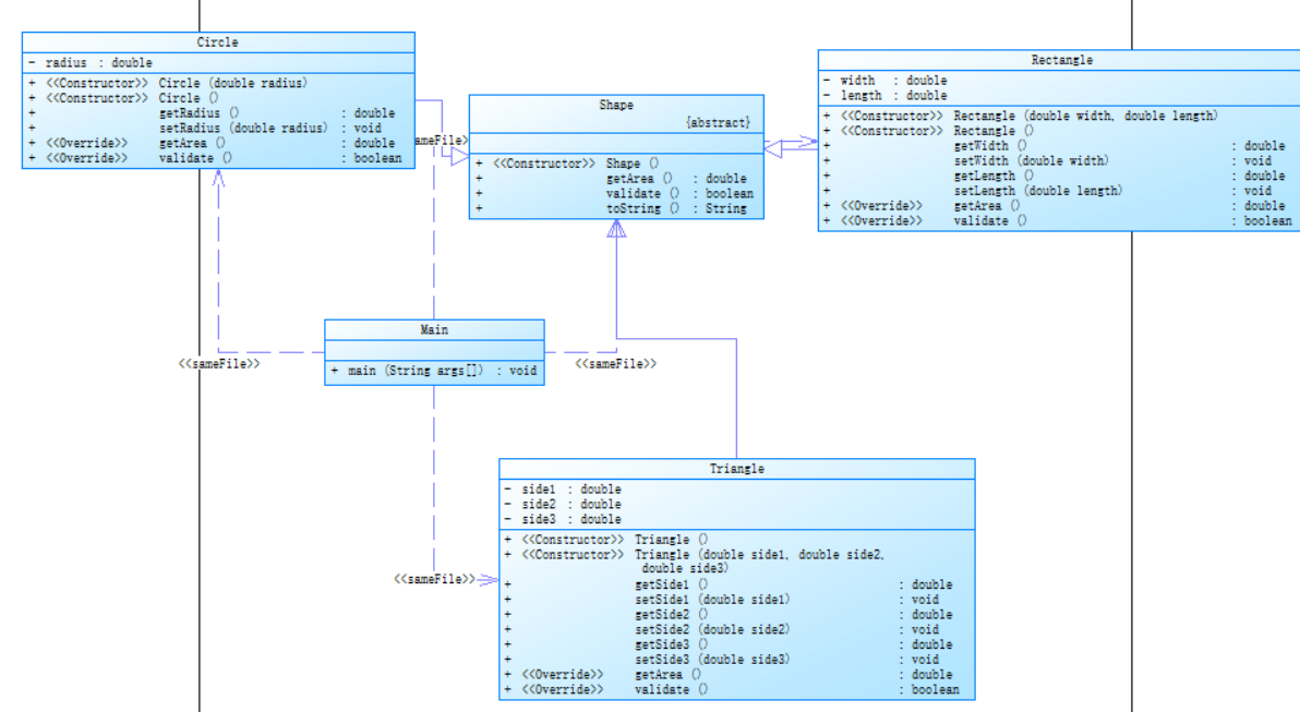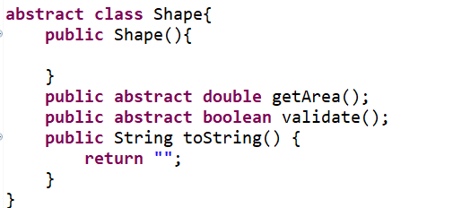 2.抽象类Shape,包括抽象方法getArea()、validate()和String toString();