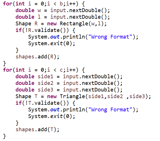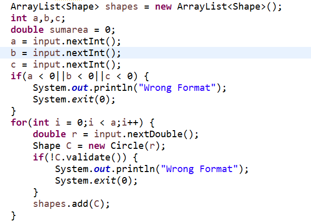 从盘首先输入三个整型值(例如a b c),分别代表想要创建的Circle、Rectangle及Triangle对象的数量,然后根据图形数量继续输入各对象的属性值(均为实型数),数与数之间可以用一个或多个空格或回车分隔。如果图形数量非法(小于0)或图形属性值非法(数值小于0以及三角形三边关系),则输出Wrong Format。