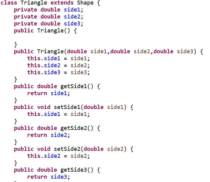 5.类Triangle,继承自Shape,有三个私有属性side1、side2、side3,重写父类继承来的求面积方法,求三角形面积;