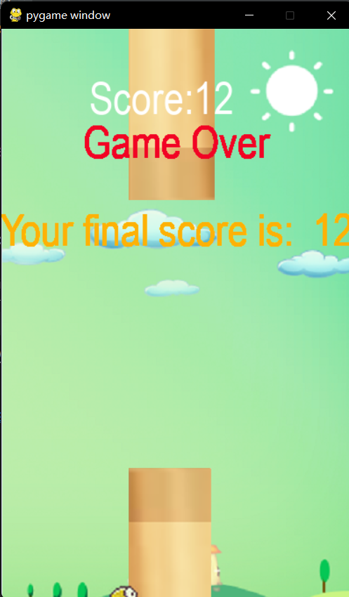 当小岛与管道相撞时,小鸟颜色变为灰色,游戏结束,并且显示总分数.在cheskDead()的函数中通过pygame.Rect()可以分别获取小鸟的矩形区域对象和管道的矩形区域对象,该对象有一个colliderect()方法可以判断两个矩形区域是否相撞。如果相撞,则设置Bird.dead属性为Trae、此外,当小岛飞出窗口时,还需要设置Bird.dead属性为True。最后,用两行文字显示总成绩。