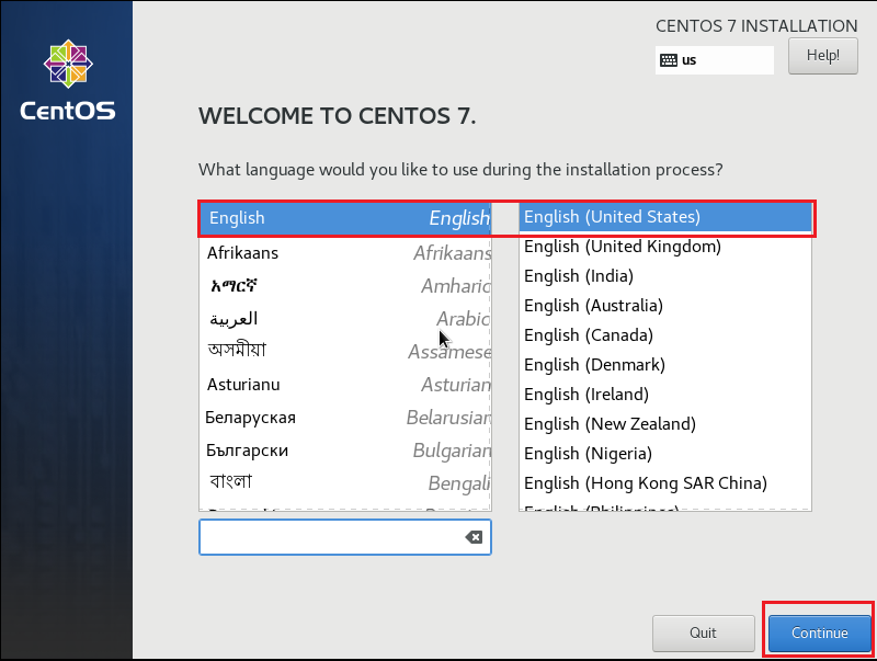 3.出现安装CentOS界面,最好选择英语安装,然后点击右下角的continue。