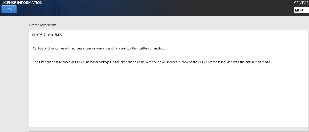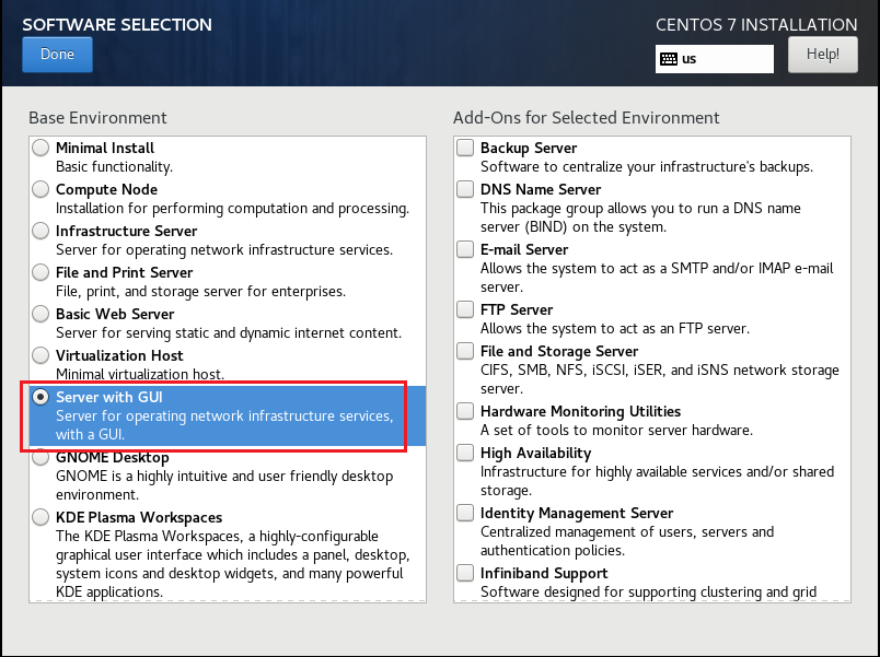 7.正式环境中都是最小化安装,我们这里是学习环境,选择图形界面安装,如下图,点击Done