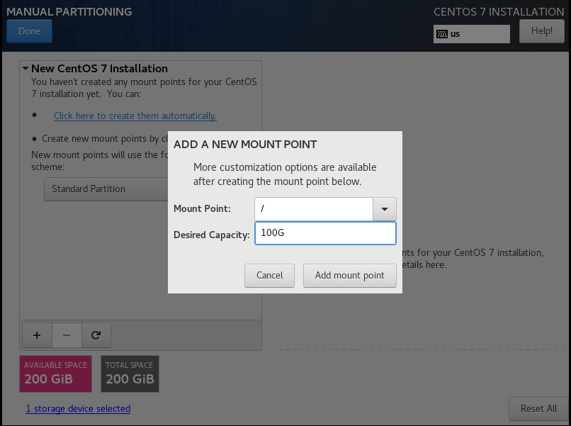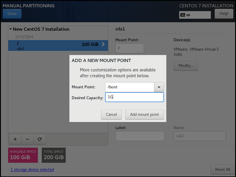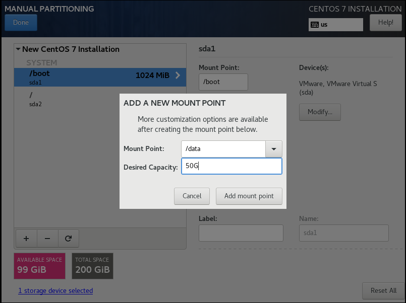 /boot分区1G;/data分区50G,此分区是为了我们以后学习测试使用;swap分区4G
