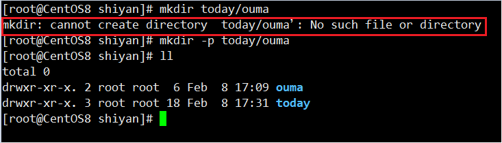 从上图可以看出,today目录不存在,直接使用mkdir today/ouma命令会出现报错,不能正常创建;这时,只需要加上选项-p就可以创建了