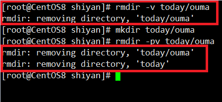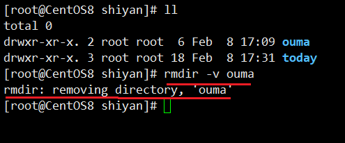 上图中-v选项会显示执行的过程:rmdir:removing directory,'ouma'