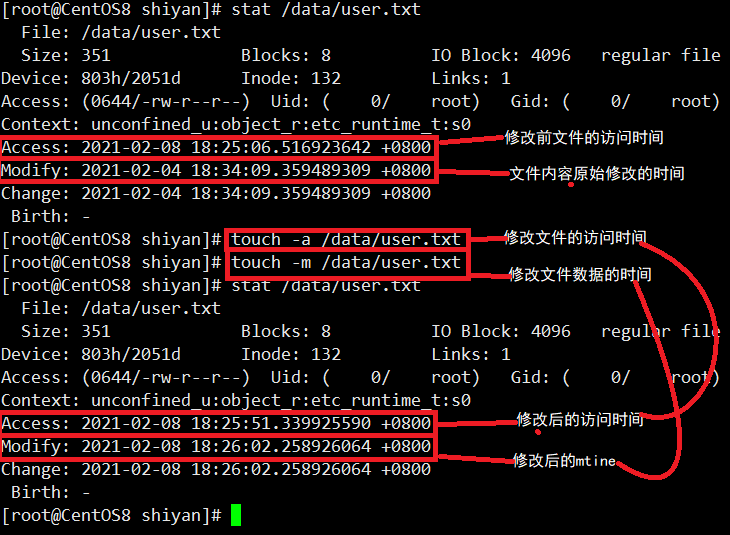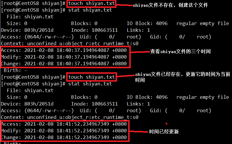 上图是touch不带选项的用法。如果文件不存在就创建大小为0的文件;如果存在就更新文件的时间为当前时间。