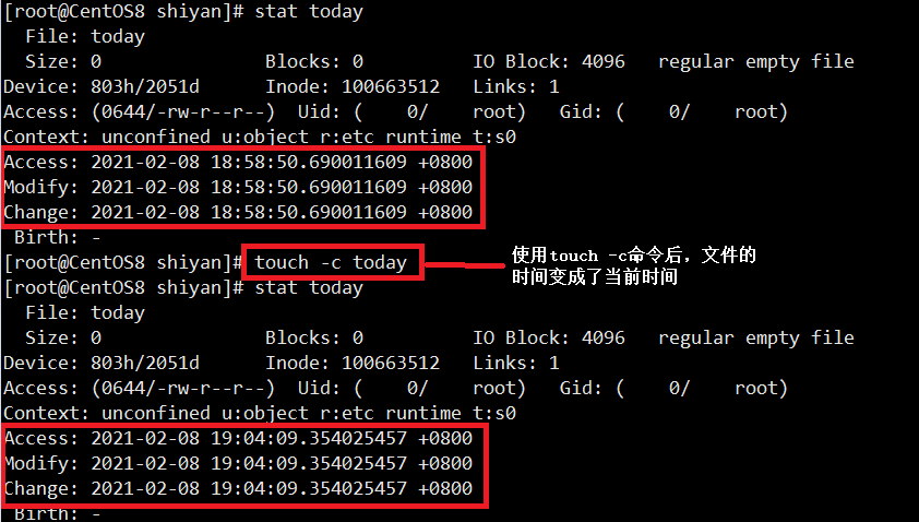 上图中touch -c的用法说明:如果文件存在,touch -c就将文件的时间更改当前时间;如果文件不存在,就不创建文件,
