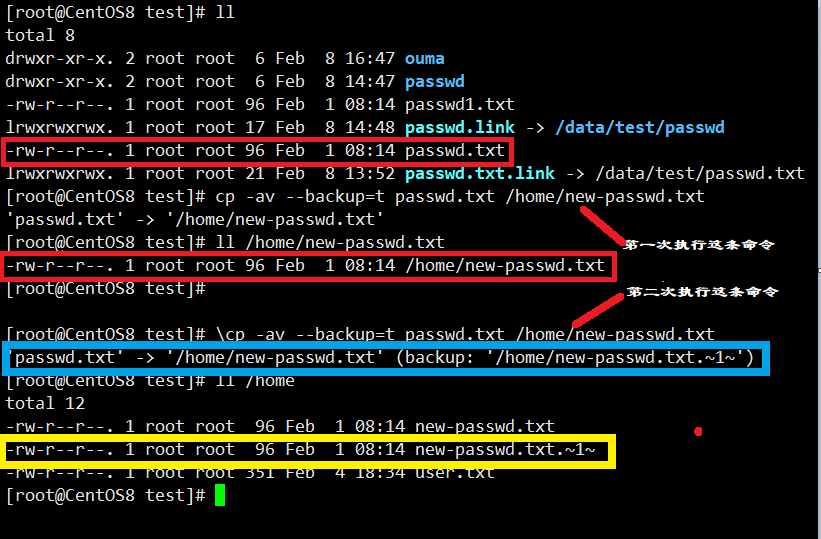 cp -av --backup=t passwd.txt /home/new-passwd.txt