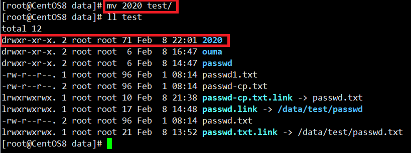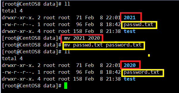 图中红色是将文件夹2021重命名为2020;途中黄色的是将文件passwd.txt重命名为password.txt。在同一个文件夹下,mv可以修改文件或文件夹的名字。
