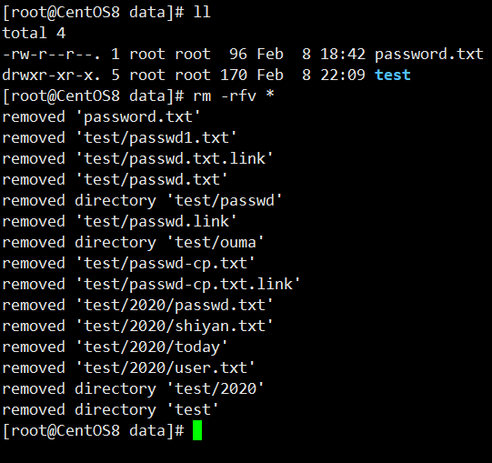 删除/data文件夹下的所有文件,使用了选项-r(删除指定文件夹所有文件和子目录),-f(强制删除不提示),-v(显示执行的过程)。