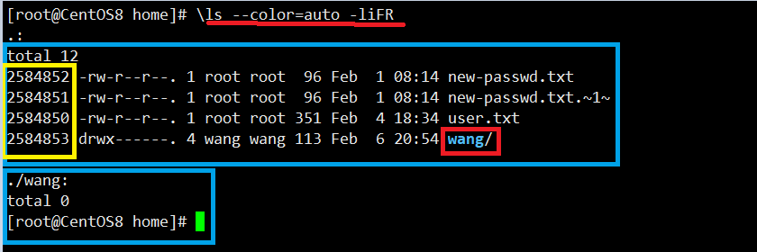 上图中红色标注wang,它有蓝色,这是使用选项--color=auto的原因;