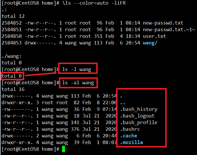 执行完命令ls -al wang后,发现出现了很多点开头的文件和文件夹,这是因为-a可以显示所有隐藏的文件。在Linux中隐藏文件都是以“.”开头的。