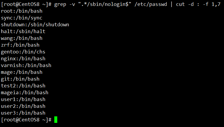 [root@CentOS8 ~]# grep -v ".*/sbin/nologin$" /etc/passwd | cut -d : -f 1,7 root:/bin/bash sync:/bin/sync shutdown:/sbin/shutdown halt:/sbin/halt wang:/bin/bash zrf:/bin/bash gentoo:/bin/chs nginx:/bin/bash varnish:/bin/bash mage:/bin/bash git:/bin/bash test2:/bin/bash mageia:/bin/bash user1:/bin/bash user2:/bin/bash user3:/bin/bash [root@CentOS8 ~]#