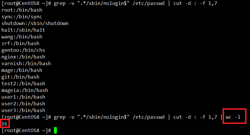 [root@CentOS8 ~]# grep -v ".*/sbin/nologin$" /etc/passwd | cut -d : -f 1,7 | wc -l 16 [root@CentOS8 ~]#
