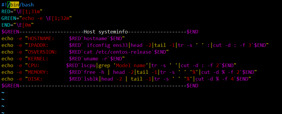 echo -e "IPADDR: $RED` ifconfig ens33|head -2|tail -1|tr -s ' ' :|cut -d : -f 3`$END"