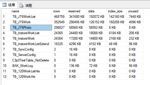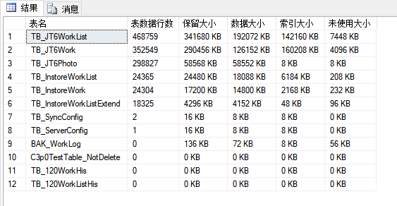 select tabname as '表名',rowsNum as '表数据行数',reserved as '保留大小',data as '数据大小',index_size as '索引大小',unused_size as '未使用大小'