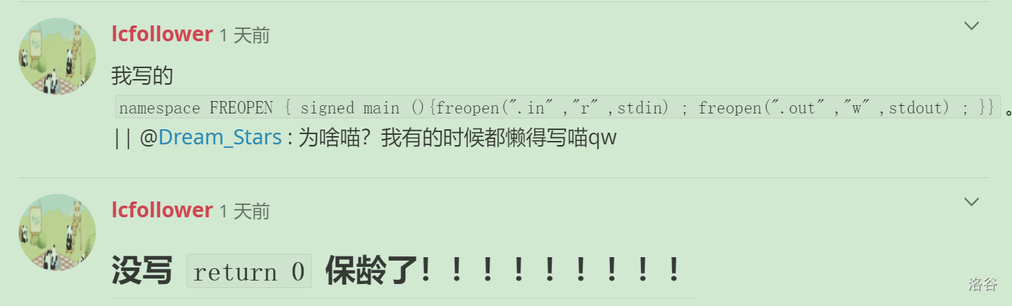 然后这天我没去吃饭,研究为啥保龄,原来是我没写 return 0。