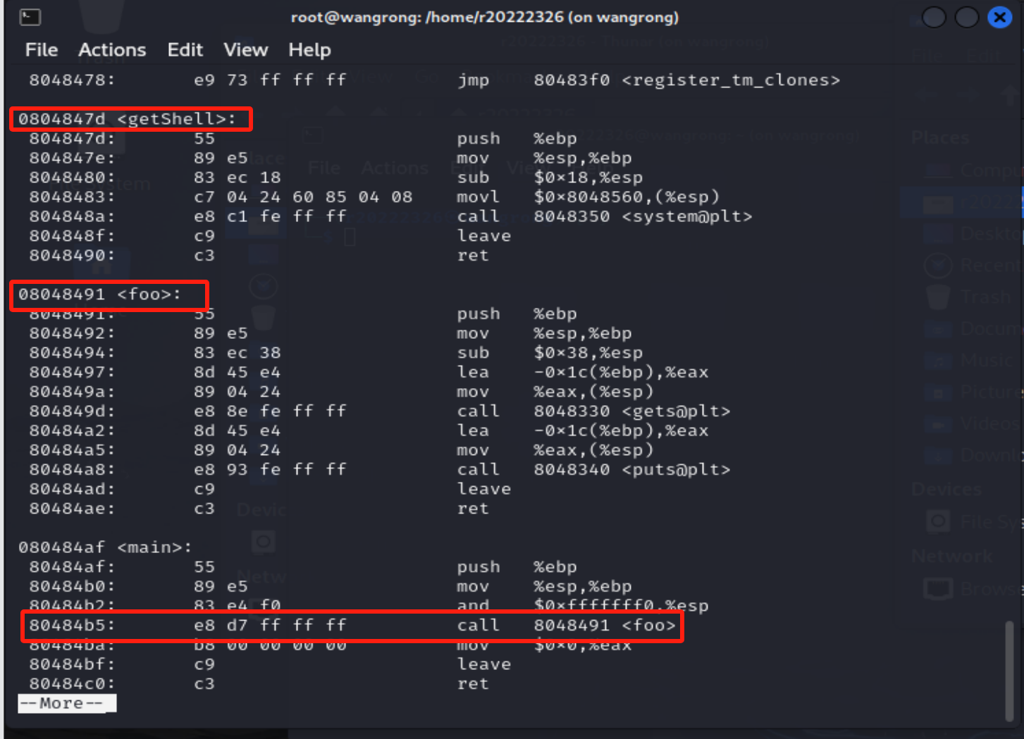 从图中可知,成功利用了foo函数的缓冲区溢出漏洞,调用了getShell函数,出现了shell.