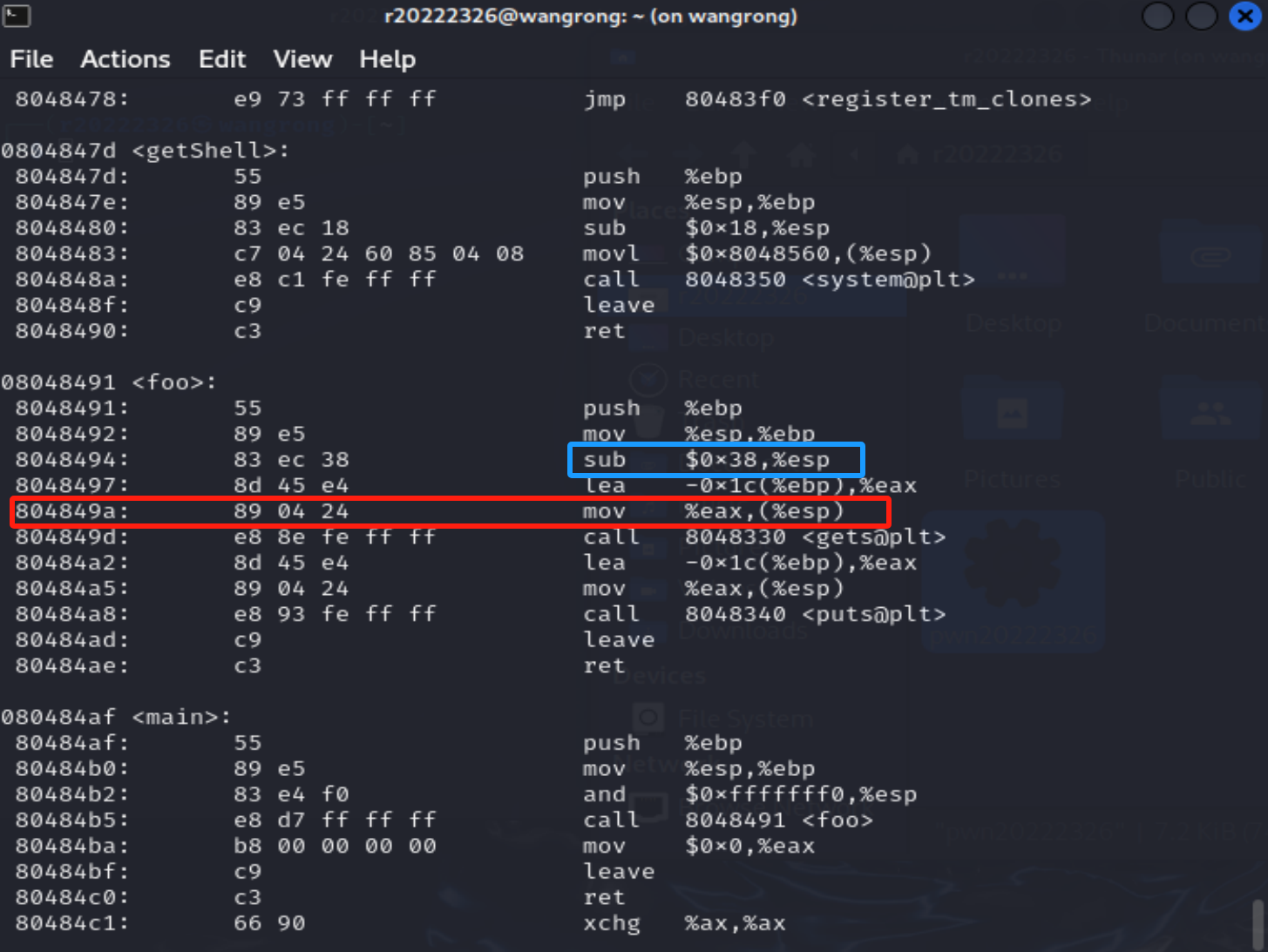 * 运行了pwn20222326后,程序会运行foo函数,此时需要输入一些字符串内容,它会打印一遍`1111111122222222333333334444444455555555`