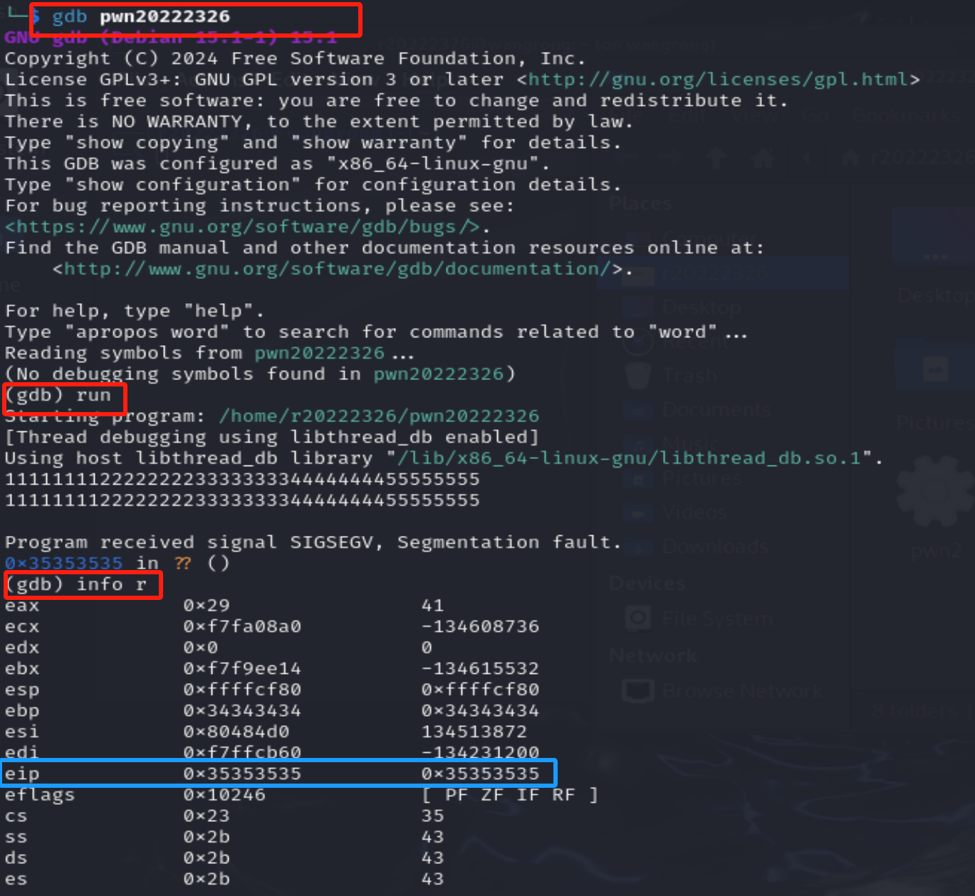 * 输入:info r 查看当前程序状态下的所有寄存器的值,从中可知eip为0x35353535,35是5的ASCII.