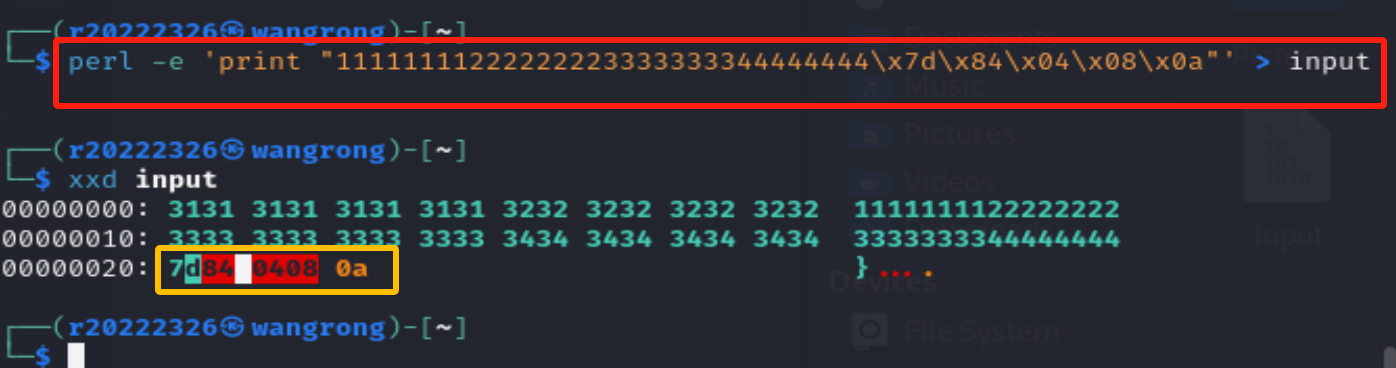 由为无法通过键盘输入\x7d\x84\x04\x08这样的16进制值,所以需要先生成包括这样字符串的一个文件。(\x0a表示回车符)。