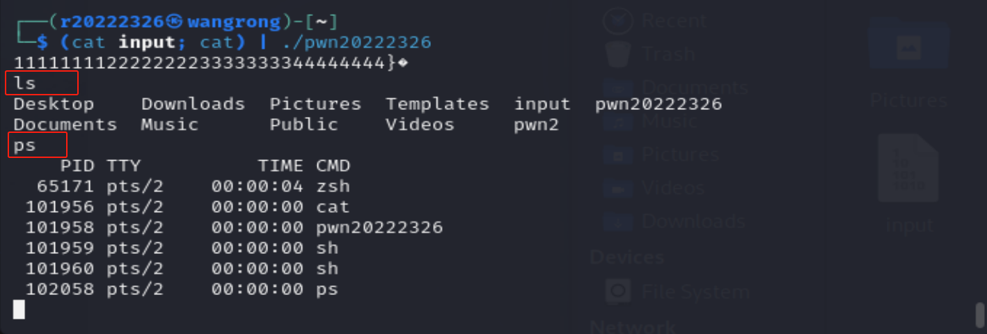 (cat input; cat) | ./pwn20222326此命令,用管道符“|”将input作为pwn20222326的输入