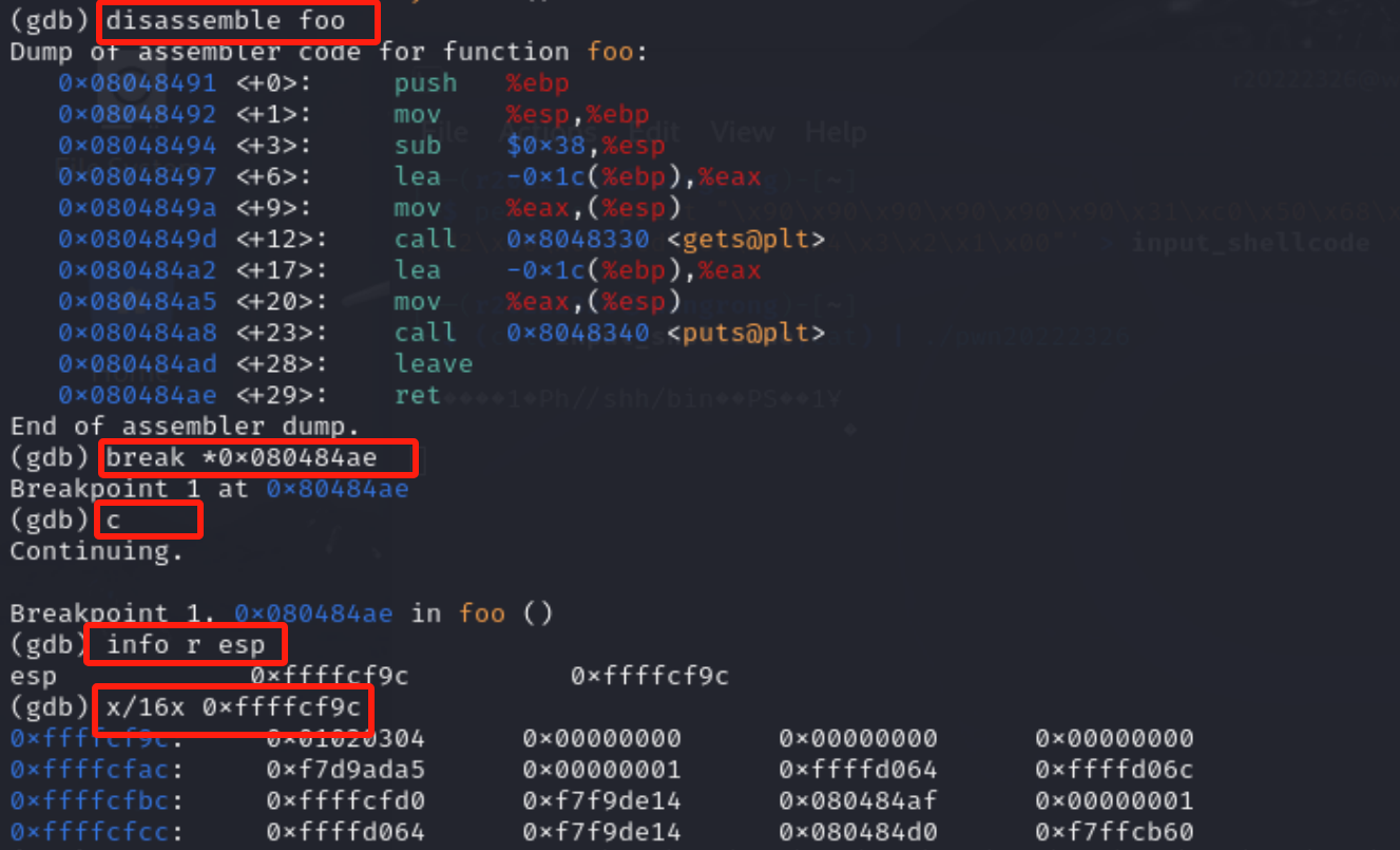 * 设置断点,查看地址 * 图中可知,断点设计到了`0x080484ae`,因为ret完,就跳到我们覆盖的retaddr了 * 在最开始的第一个终端中按下回车,与(二)中的`\x0a`类似 * 输出c 继续 * 遇到断点之后,通过 info r esp 来查看当前栈顶的地址。由图中可知,地址为`0xffffcf9c` * 通过x/16x 0xffffcf9c,来查看从地址 0xffffcf9c 开始,显示 16 个字(4 字节)的内存内容。 * 可知`01020304`的地址是`0xffffcf9c`,那么shellcode的地址就是紧挨着+4`0xffffcfa0`