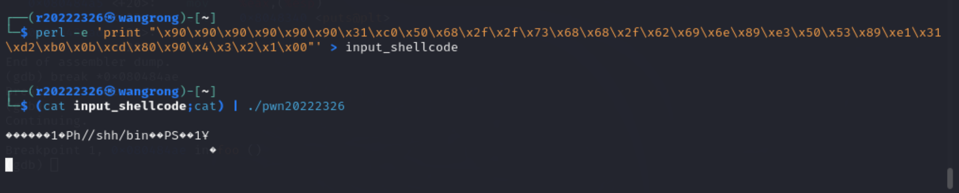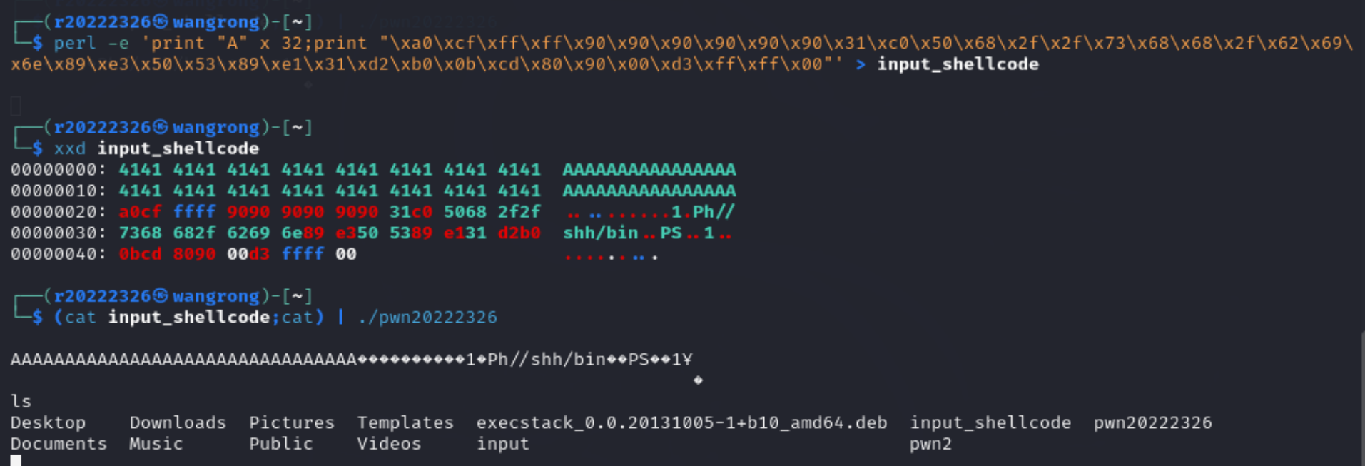 * `xxd input_shellcode`十六进制查看input_shellcode,可以看到a0cf····,说明修改成功 * 通过(cat input_shellcode;cat) | ./pwn20222326命令,进行运行,出现了shell,成功!