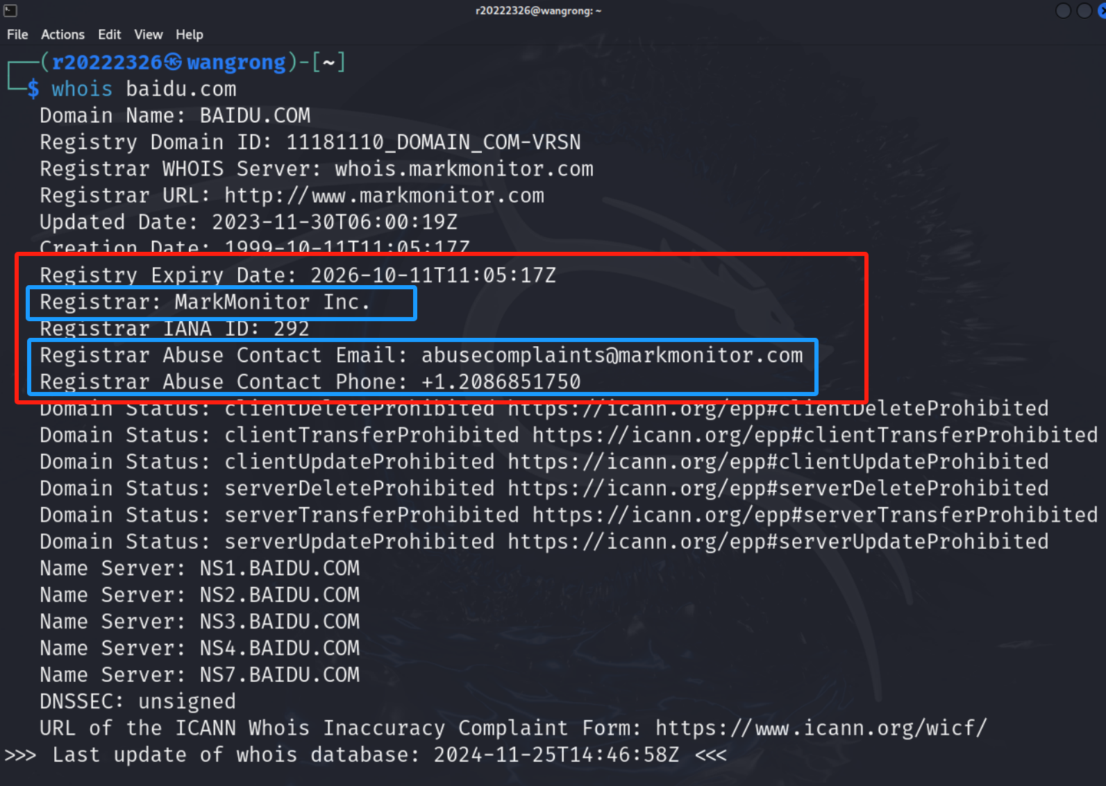 (1)选择baidu.com进行查询。查询DNS注册人及联系方式,利用whois baidu.com命令