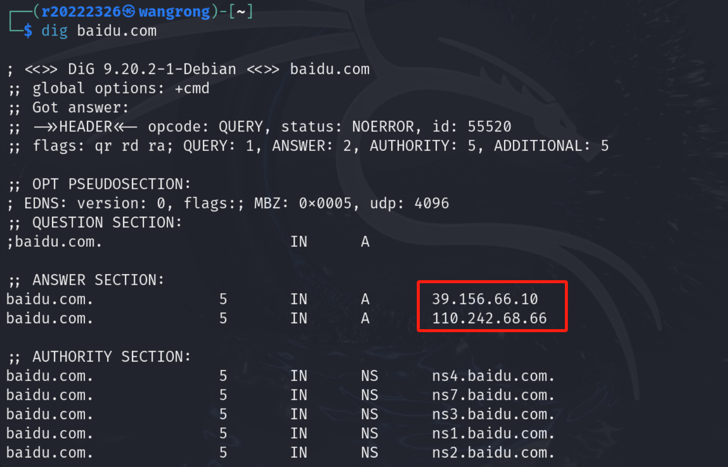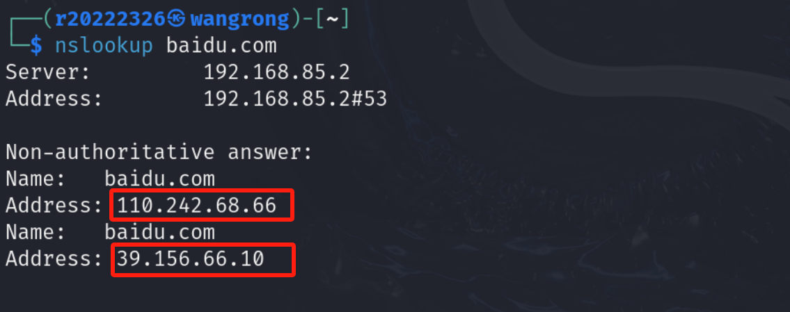 (2)查询baidu.com该域名对应IP地址,利用nslookup baidu.com命令和dig baidu.com